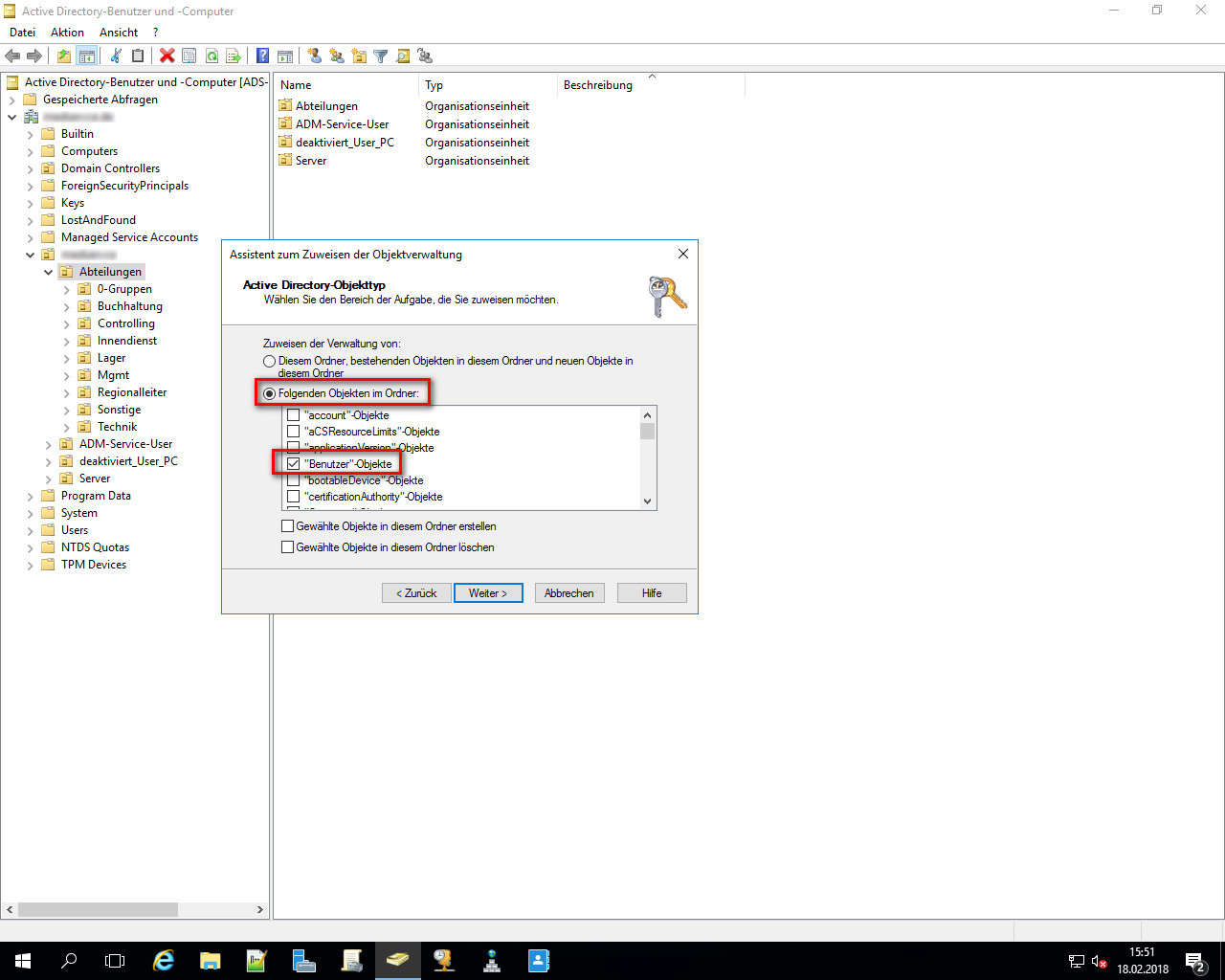 Wie bereits geschrieben wird die Berechtigung für das zurücksetzen der Benutzerpasswörter einer Sicherheitsgruppe delegiert. In unserem Fall ITSupport. In der Konsole Active Directory-Benutzer und -Computer (dsa.msc). Je nach AD Struktur bzw. Firmenpolicy wählt man nun die entsprechende Organisationseinheit (OU) aus für die die Berechtigung gesetzt werden soll. Mit einem Rechtsklick wird im Kontexmenü „Objektverwaltung zuweisen…“ ausgewählt. Den Rest entnehmt ihr den Screenshots.